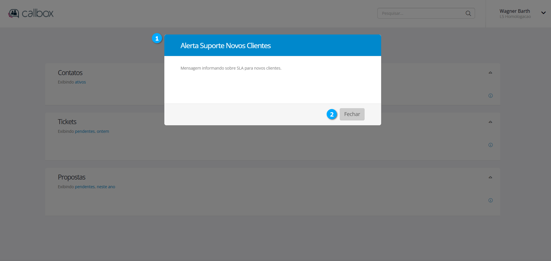 Ao acessar o painel, caso existam alertas (1) configurados ele serão exibidos para o usuário, clique em Fechar (2) para continuar com o acesso. para saber mais sobre como configurar alertas clique aqui