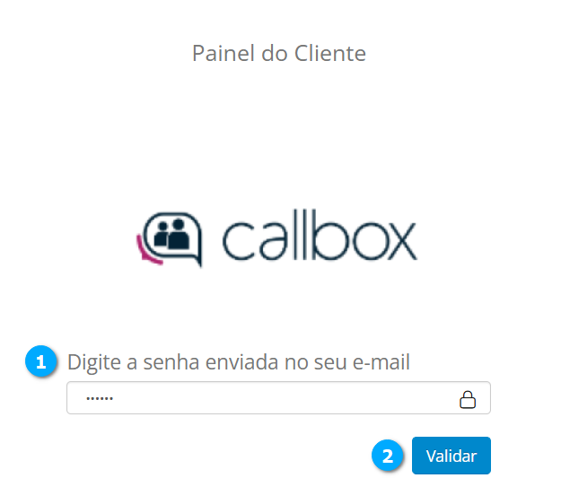 Após receber o código em seu e-mail copie e cole no campo Digite a senha enviada no seu e-mail (1) e clique em Validar (2) para acessar o painel.