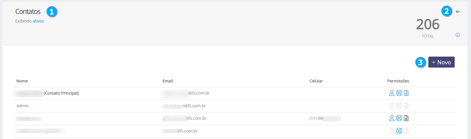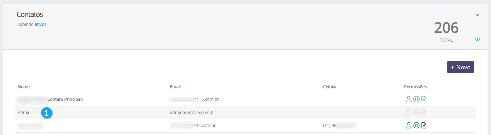 Na aba de contatos o usuário pode editar os dados principais do contato, suas permissões e também adicionar novos contatos.