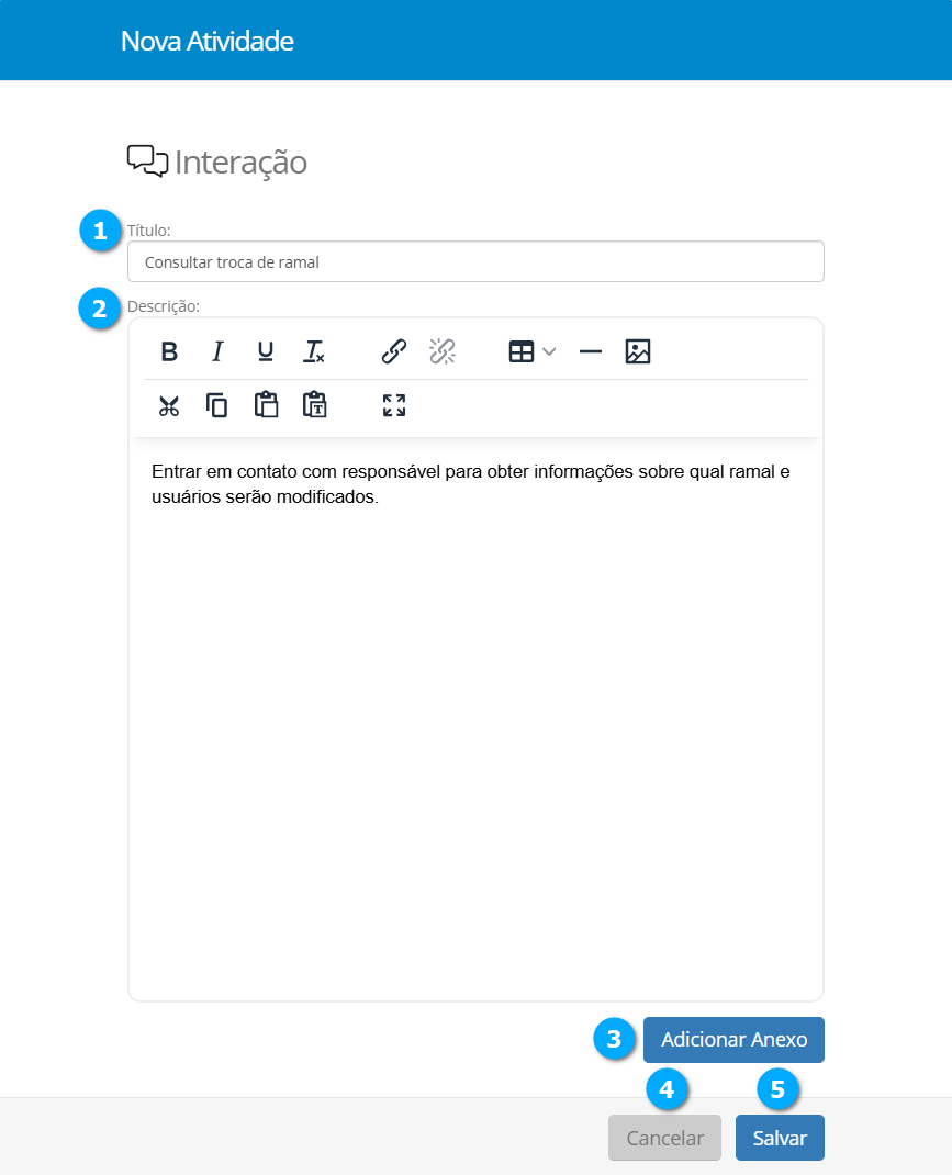 Descrição (2) - caixa de edição de textos para descrever o que deve ser feito nesta atividade, com possibilidade de inserção de imagens, links, etc…