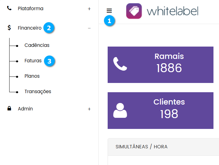 Para acessar a tela de Faturas expanda o Menu (1) e clique em Financeiro (2) seguido de Faturas (3).