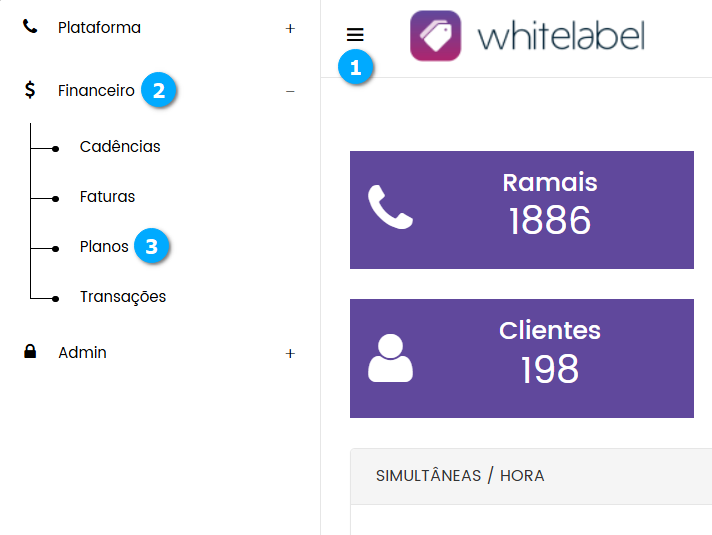 Para acessar a tela de Planos expanda o Menu (1) e clique em Financeiro (2) seguido de Planos (3).
