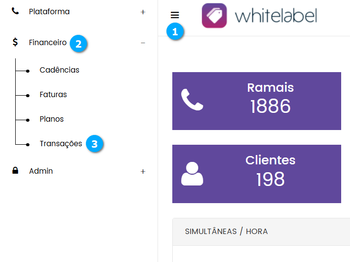 Para acessar a tela de Transações expanda o Menu (1) e clique em Financeiro (2) seguido de Transações (3).
