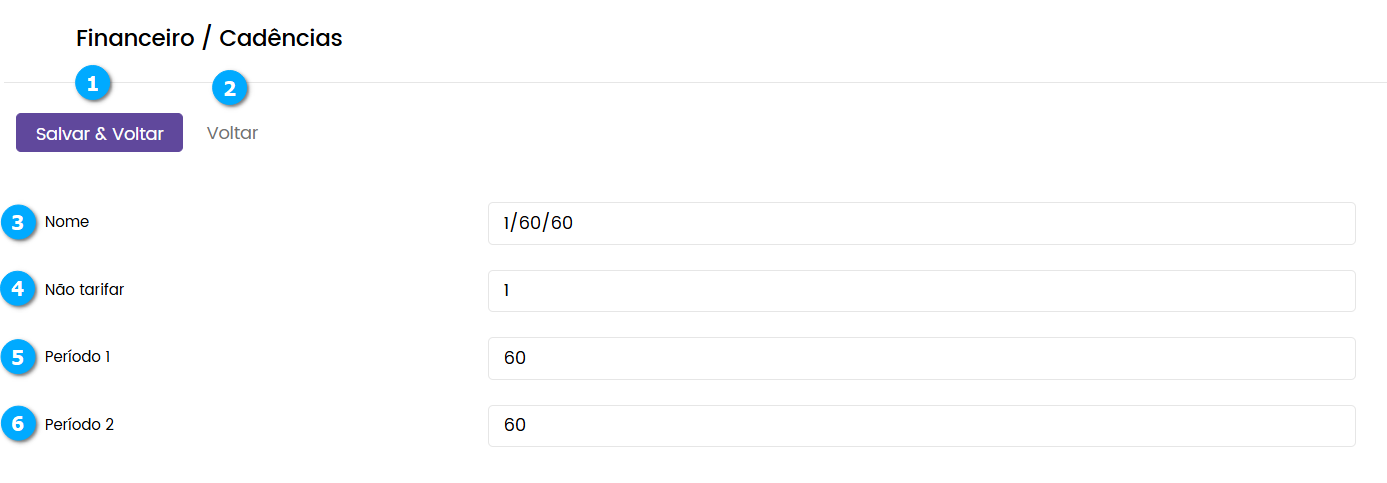 Na tela de Cadências o administrador cria a regra como o minuto será cobrado por chamada, a plataforma permite utilizar a regra nt/p1/p2 onde: