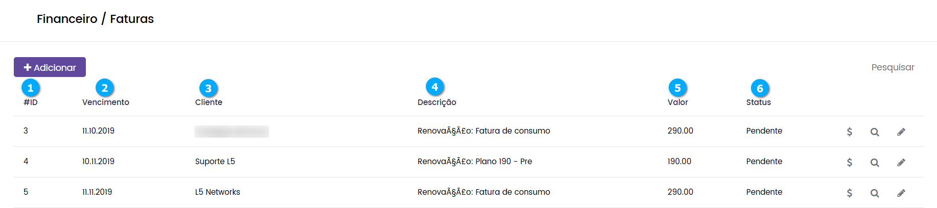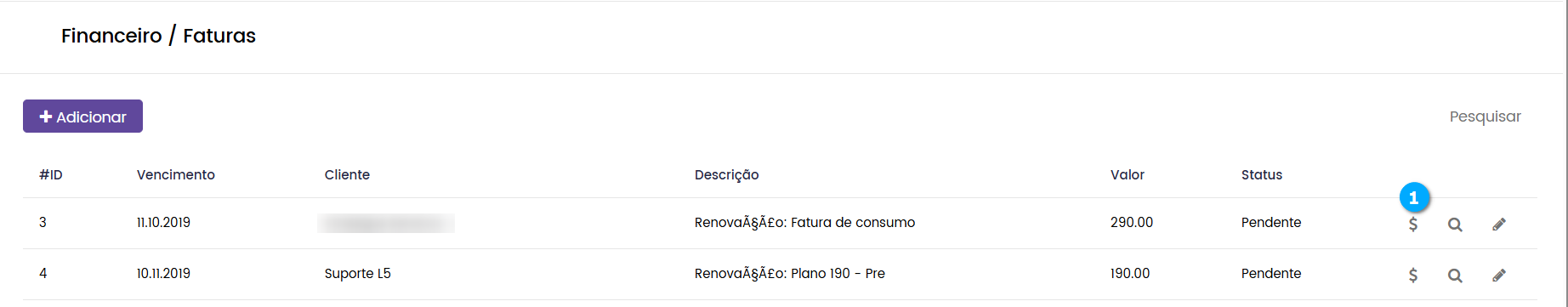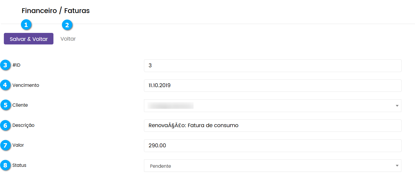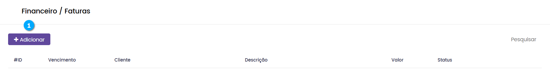 Na tela de Faturas o administrador pode criar as faturas que serão atribuídas a seus clientes.