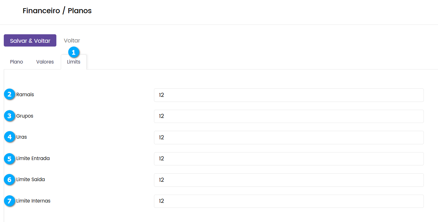 Limite Internas (7) - define a quantidade máxima de chamadas internas para o plano