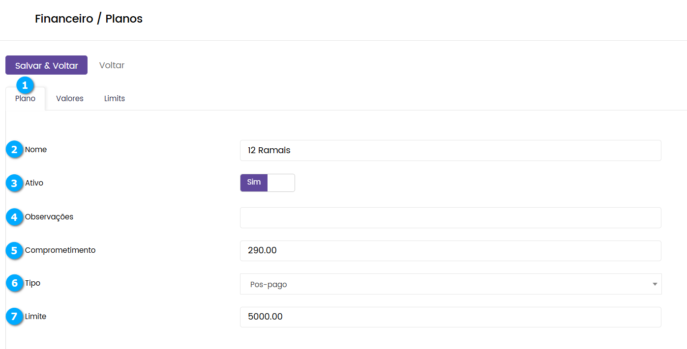 Plano (3) - aba destinada as configurações básicas do plano