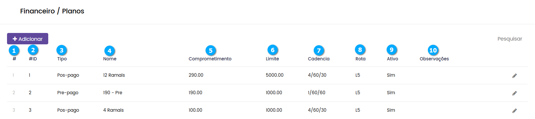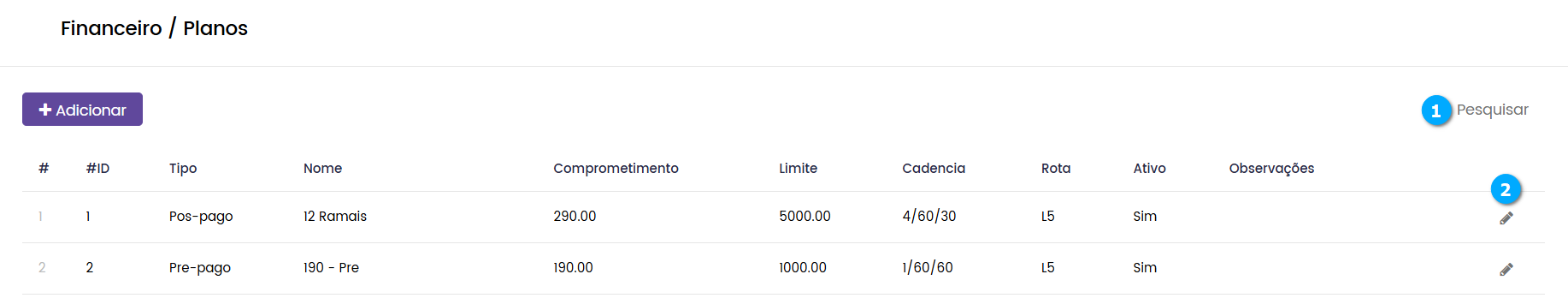 Editar (2) - botão para editar as configurações do plano